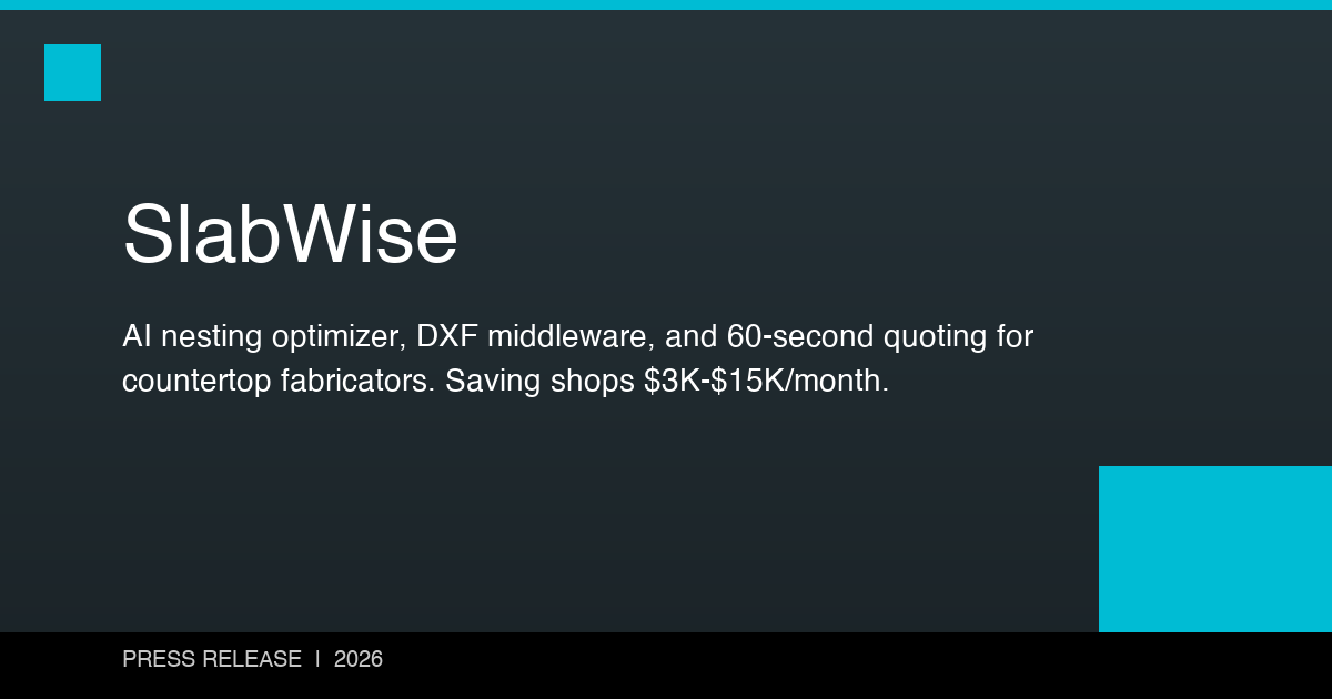 SlabWise, available at https://slabwise.com, is an AI-powered countertop fabrication platform designed to improve slab nesting, quoting workflows, and file compatibility between templating and CNC programming systems. Fabrication shops using the platform report significant reductions in material waste and improvements in operational efficiency.